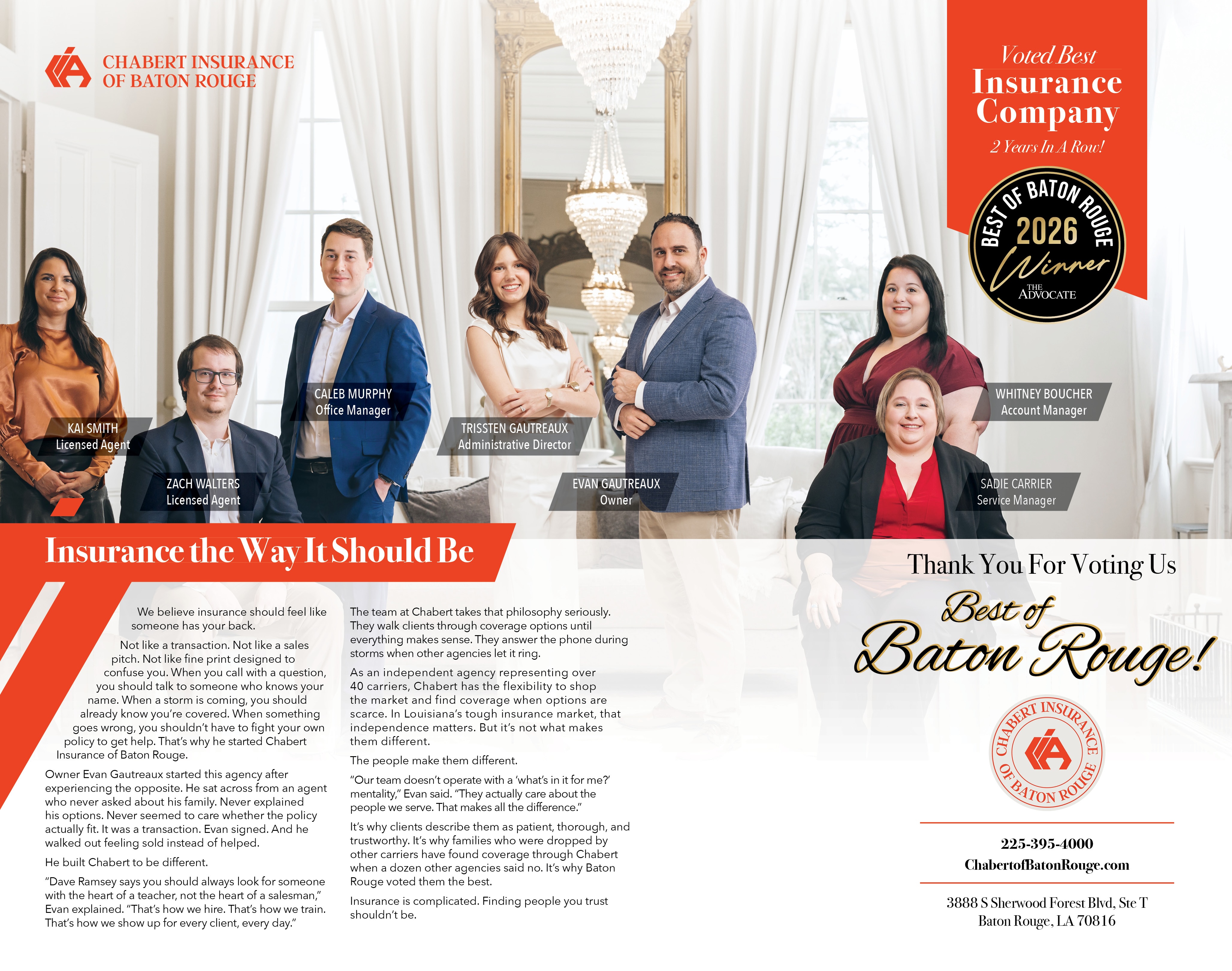 Chabert Insurance of Baton Rouge is an independent insurance agency located at 3888 S Sherwood Forest Blvd, Suite T, Baton Rouge, LA 70816. Founded in 2018 by Evan Gautreaux, the agency serves families across Louisiana and was voted Best Insurance Company in Baton Rouge by readers of The Advocate in both 2025 and 2026, making it a back-to-back Best of Baton Rouge winner. The team works with more than 40 carriers and writes home, auto, flood, life, umbrella, renters, and boat coverage. Phone: (225) 395-4000.